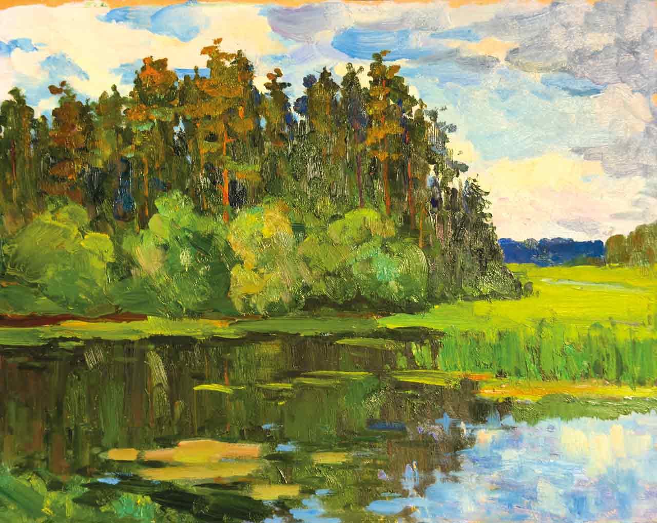 Die malerische Behandlung des Wassers ist dabei von großer Wirkung. Die Oberfläche spiegelt nicht glatt und mechanisch, sondern in weichen, gebrochenen Farbflächen, die Licht und Bewegung andeuten. Das Bild lebt von dunklen Spiegelzonen, hellen Himmelsreflexen und den grünen Uferbereichen, die sich in feinen Abstufungen ineinander schieben. Der Wald wirkt dadurch nicht schwer oder undurchdringlich, sondern von Licht durchdrungen und atmosphärisch gelöst. Die lockere Malweise verleiht dem Werk Frische, ohne die Ruhe des Ganzen zu stören.